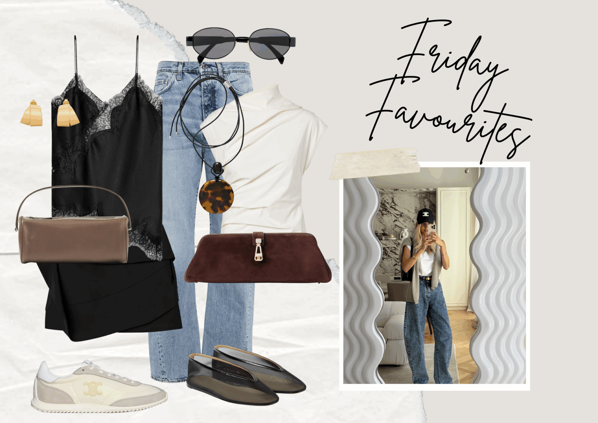 Friday Faves featuring lace detail camisole and sleek neutral clothing and bleached denim jeans